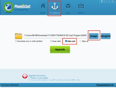② روی دکمه Firmware کلیک کرده، سپس روی Image کلیک کنید تا فایل ایمیج مربوط به رایت را انتخاب کنید. سپس روی Wipe part کلیک کنید.